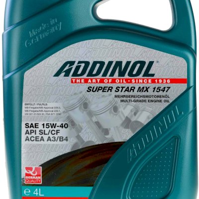 Dầu động cơ hiệu suất cao ADDINOL Super Star MX 1547 có thành phần chính là dầu khoáng tinh lọc chất lượng cao, cùng với nhiều gói phụ gia đặc biệt để đảm bảo độ sạch tuyệt đối cho động cơ, chống ăn mòn cũng như khả năng chống oxy hóa nhiệt cao. Sản phẩm hàng đầu phù hợp cho các yêu cầu cao nhất đối với động cơ xăng và động cơ dầu diesel.