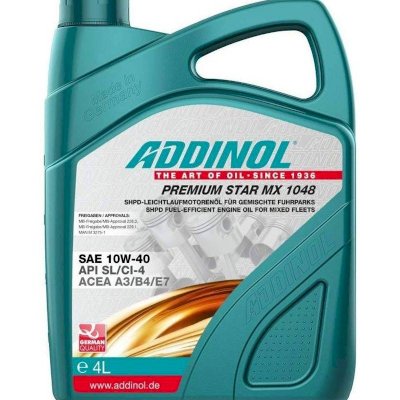 ADDINOL Premium Star MX 1048 là loại dầu động cơ hiệu suất cao mới được phát triển dựa trên nguyên lý tiết kiệm nhiên liệu với cấp độ nhớt SAE 10W-40. Sản phẩm là một sự kết hợp lý tưởng của các loại dầu gốc tổng hợp và các phụ gia tiên tiến đảm bảo một hiệu suất vượt trội với SAPS thấp và đặc tính bền bỉ. Loại dầu động cơ hiệu suất cao này đáp ứng những yêu khầu khắc nghiệt về khí thải theo tiêu chuẩn Euro 4 và Euro 5 cho động cơ xăng và dầu diesel.