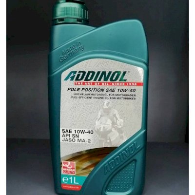 Nhớt Addinol 10W40 là loại dầu động cơ được nhập khẩu từ Đức, có hiệu suất cao dành cho xe máy 4 thì phù hợp với tiêu chuẩn của các nhà sản xuất hàng đầu Nhật Bản và Châu Âu.